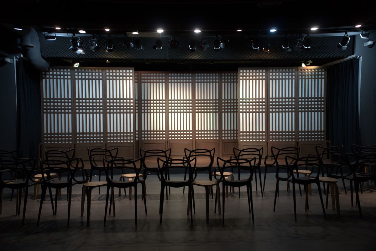 Featuring traditional lattice patterns and changhoji-covered doors—thin, translucent paper traditionally used in Korean interiors, this spacious hall blends dark modern tones with touches of dancheong, the vibrant patterns found in traditional Korean architecture.